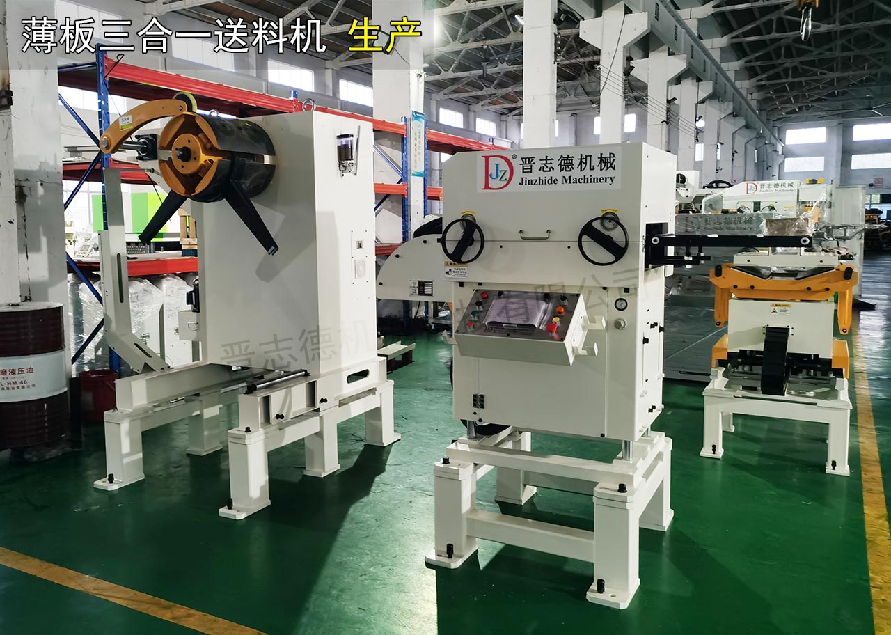目前,國內送料機生產廠家很多,但能生產大型沖壓自動化設備的企業屈指可數,而且高端送料機少之又少。為此,晉志德機械推出三合一送料機,其集料架、整平、送料于一體,配有晉志德自開發的控制模快的裝置,相較于傳統材料架+整平機+送料機分體組成的沖壓生產線,使用三合一送料機能大的節省廠房空間、提高沖壓成品品質、簡化操作流程,是目前為沖床材料供給的佳自動化模式。